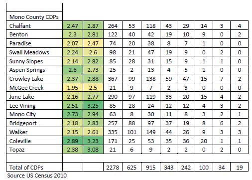 The 2010 census reports the total number of households in the unincorporated county to be 2,539 Average household countywide decreased slightly from 2.51 in 1990 to 2.42 in 2010 Coleville had the highest average household sizes, with 2.89 persons per household. McGee Creek and Paradise had the lowest average household sizes, with 1.95 persons/household and 2.07 persons per household, respectively (Table 7).